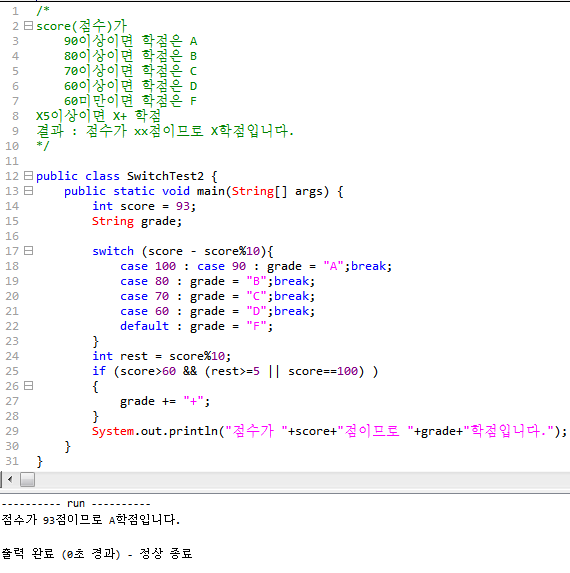 **switch의 값비교는 숫자형만 가능. (아스키코드값을 가진 char도 가능.)