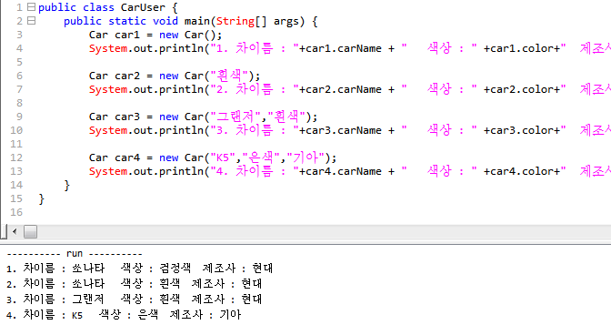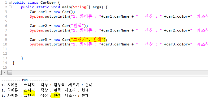 //System.out.println(">>>>>>>>>>>>>>>>>>>>"+car.color); //흰색으로 나옴.