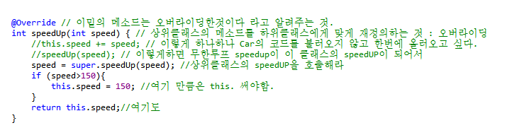 override할때는 위에 @Override를 써주는 것이 좋음. 또한 메소드 이름을 꼭 맞춰야함.